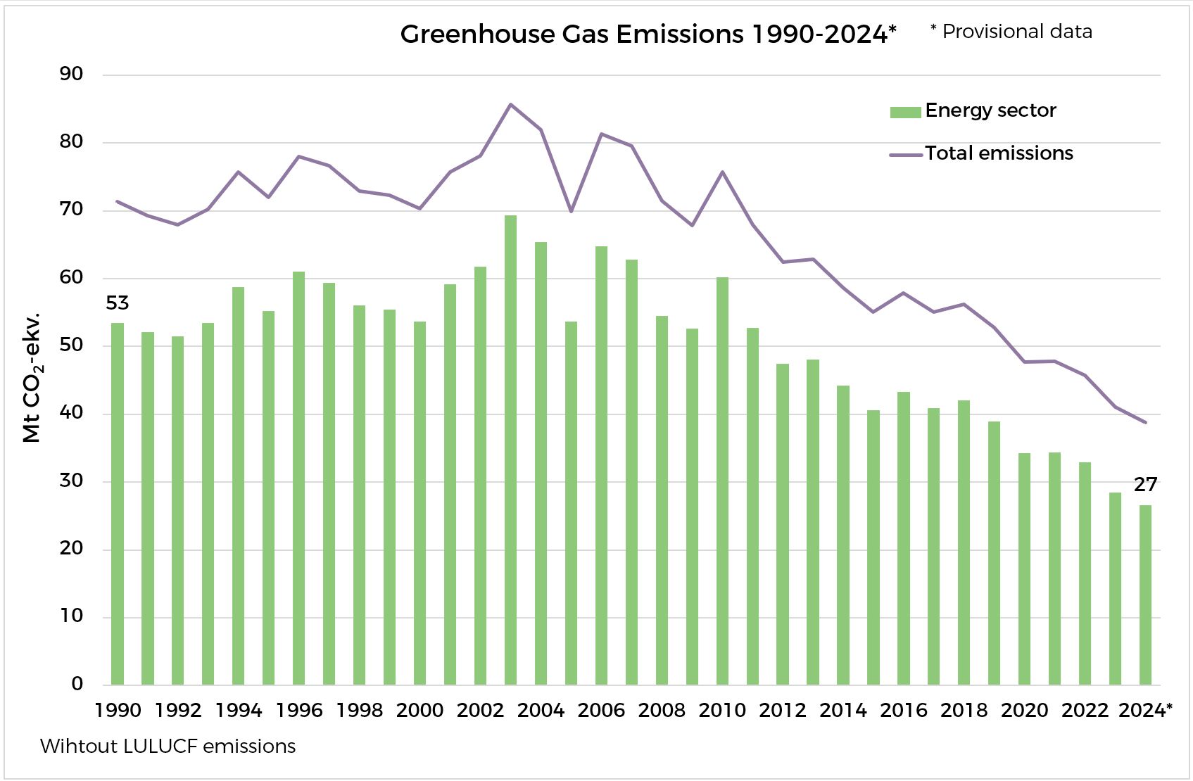Carbon dioxide emissions relating to energy production and consumption were 26.6 million tonnes in 2024, contributing about 69 per cent to the total CO2 emissions in Finland. Emissions in the sector went down by 1.9 million tonnes of CO2 equivalent from 2023, which corresponded to a fall of nearly seven per cent. The use of hard coal and peat decreased in particular, as a result of which emissions caused by incineration decreased by 0.9 million tonnes of CO2 equivalent for hard coal and 0.6 million tonnes for peat. The decrease in emissions was affected by growth in production of renewable energy, especially wind power, and increased net imports of electricity.