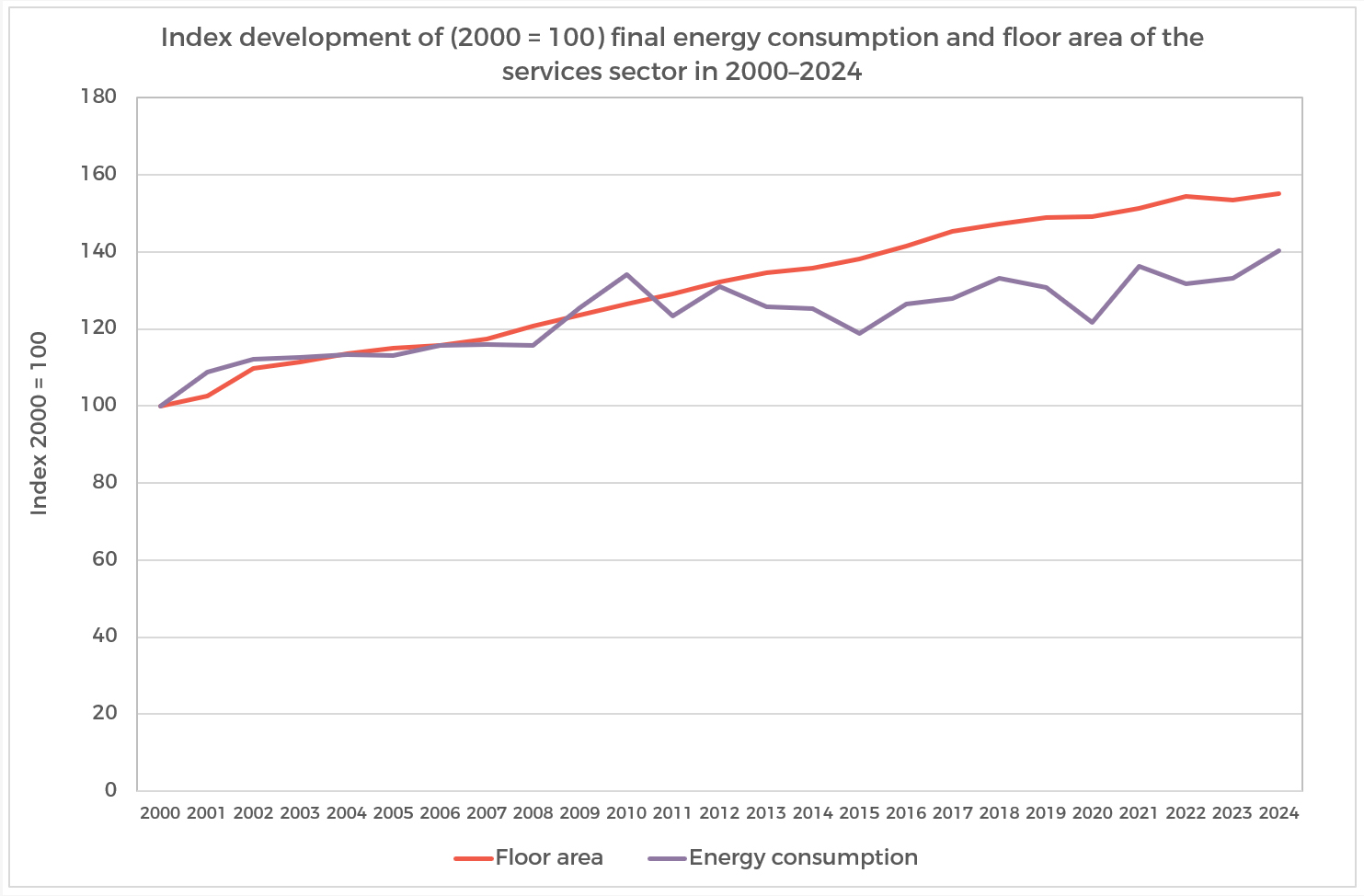 - Final energy consumption in services increased by 40% over 2000–2024 (without temperature correction). During the same period, total floor area increased by 55%; growth occurred in all sectors, particularly in commercial buildings (+60%) and warehouse buildings (+67% over 2005–2024).