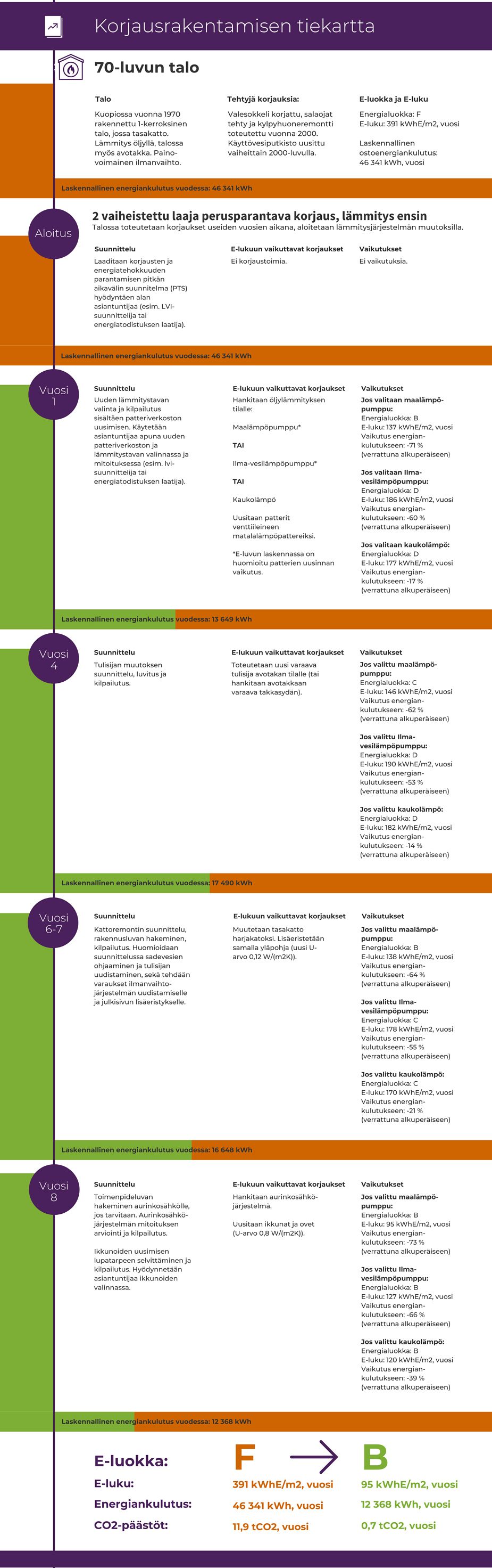 Seuraavassa on esitetty esimerkki öljylämmitteisen 1970-luvulla rakennetun pientalon vaiheistetusta energiaremontista, jossa muutetaan ensin lämmitysmuoto ja myöhemmin tasakatto harjakatoksi.