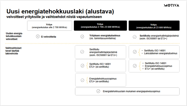 Huom! Uusi energiatehokkuuslaki on eduskunnan käsittelyssä ja se tulee voimaan loppuvuodesta. Tiedot lakisääteisistä katselmusvelvoitteista tullaan päivittämään tälle sivulle lain voimaantulon jälkeen. Alla olevassa infograafissa on alustavasti kuvattu tulevat lakivelvoitteet yrityksille, mutta ne varmistuvat vasta lain tuntua voimaan. |