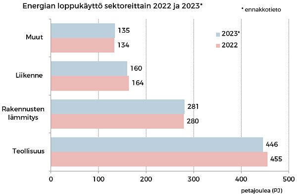 Kuva 3. Energian loppukäyttö sektoreittain vuosina 2023 ja 2024.