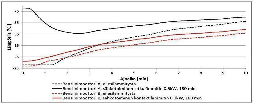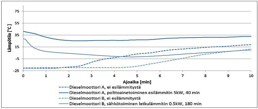 Kuva 2. Esimerkki moottorin esilämmityksen ja lämmitintyypin vaikutuksista jäähdytysnesteen lämpötilaan käynnistyksen jälkeen (ulkolämpötila -20 °C).