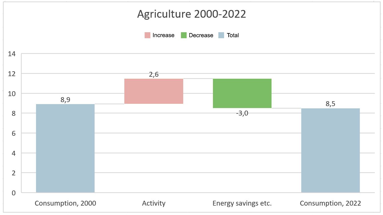 I nästa figur visas jordbrukssektorns slutliga energiförbrukning 2000 och 2022 samt en analys av faktorer som har påverkat den observerade förändringen i förbrukningen (s.k. dekomponeringsanalys).
