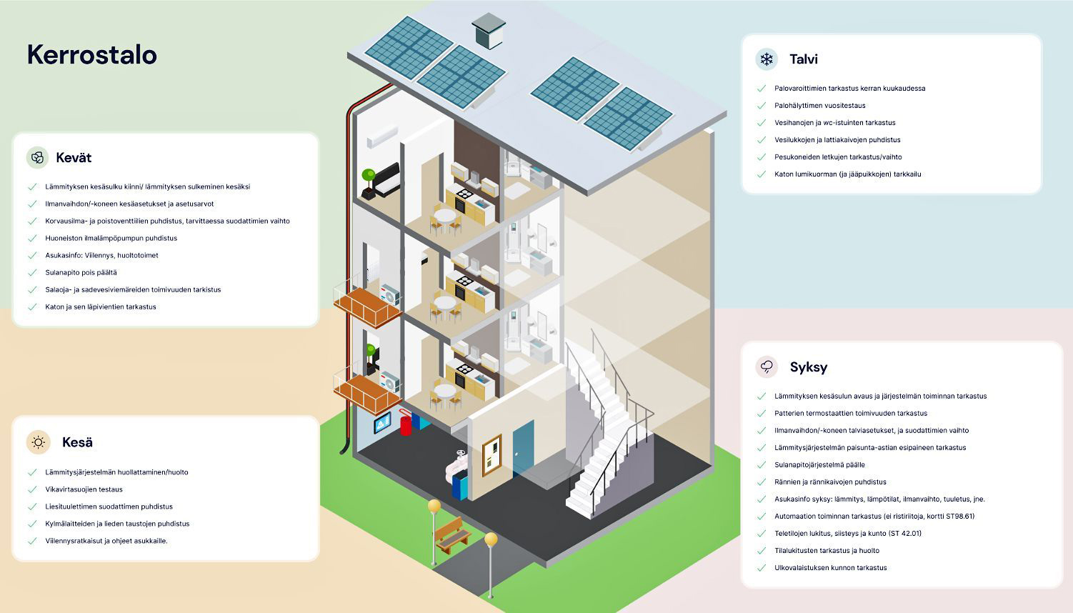 | Kevät: – Kulutusseuranta: lämpö, sähkö ja vesi (jatkuva) – Lämmityksen kesäsulku kiinni/lämmityksen sulkeminen kesäksi – Ilmanvaihdon/-koneen kesäasetukset ja asetusarvot – Ilmanvaihto-/ilmastointikoneen suodattimien vaihto ja venttiilin puhdistus – Jäähdytyksen toiminnan tarkastus – Lämpöpumput: ilmalämpöpumpun puhdistus, lämmitys- ja maapiirin sihdin puhdistus – Asukas/käyttäjäinfo kevät (viilennys, jäähdytys, huoltotoimet) – Sulanapito pois päältä – Salaoja- ja sadevesiviemäreiden toimivuuden tarkastus – Katon ja sen läpivientien tarkastus | Kesä: – Kulutusseuranta: lämpö, sähkö ja vesi (jatkuva) – Lämmitysjärjestelmän huollattaminen/huolto – Kylmäaineiden vuototarkastukset (lämpöpumput) – Kattilat ja tulisijat: puhdistus ja säätö, polttimen vaihto, nuohous, energiatehokkuustarkastus – Vikavirtasuojien testaus – Liesituulettimen suodattimen puhdistus – Kylmälaitteiden ja lieden taustojen puhdistus – Viilennysratkaisut ja ohjeet asukkaille |