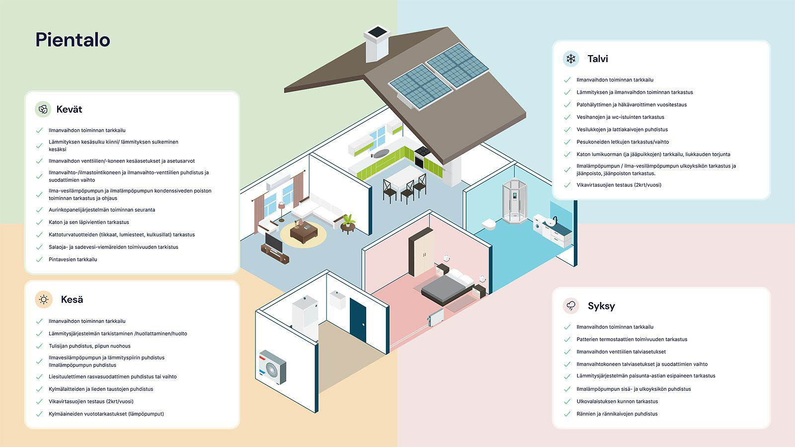 | Kevät: – Ilmanvaihdon toiminnan tarkkailu – Lämmityksen kesäsulku kiinni/lämmityksen sulkeminen kesäksi – Ilmanvaihdon venttiilien/-koneen kesäasetukset ja asetusarvot – Ilmanvaihto-/ilmastointikoneen ja ilmanvaihto-venttiilien puhdistus ja suodattimien vaihto – Ilma-vesilämpöpumpun ja ilmalämpöpumpun kondenssiveden poiston toiminnan tarkastus ja ohjaus – Aurinkopanelijärjestelmän toiminnan seuranta – Katon ja sen läpivientien tarkastus Kattoturvatuotteiden (tikkaat, lumiesteet, kulkusillat) tarkastus – Salaoja- ja sadevesi-viemäreiden toimivuuden tarkistus – Pintavesien tarkkailu | Kesä: – llmanvaihdon toiminnan tarkkailu – Lämmitysjärjestelmän tarkistaminen/huollattaminen/huolto – Tulisijan puhdistus, piipun nuohous – Ilmavesilämpöpumpun ja lämmityspiirin puhdistus – Ilmalämpöpumpun puhdistus – Liesituulettimen rasvasuodattimen puhdistus tai vaihto – Kylmälaitteiden ja lieden taustojen puhdistus – Vikavirtasuojien testaus (2krt/vuosi) – Kylmäaineiden vuototarkastukset (lämpöpumput) |