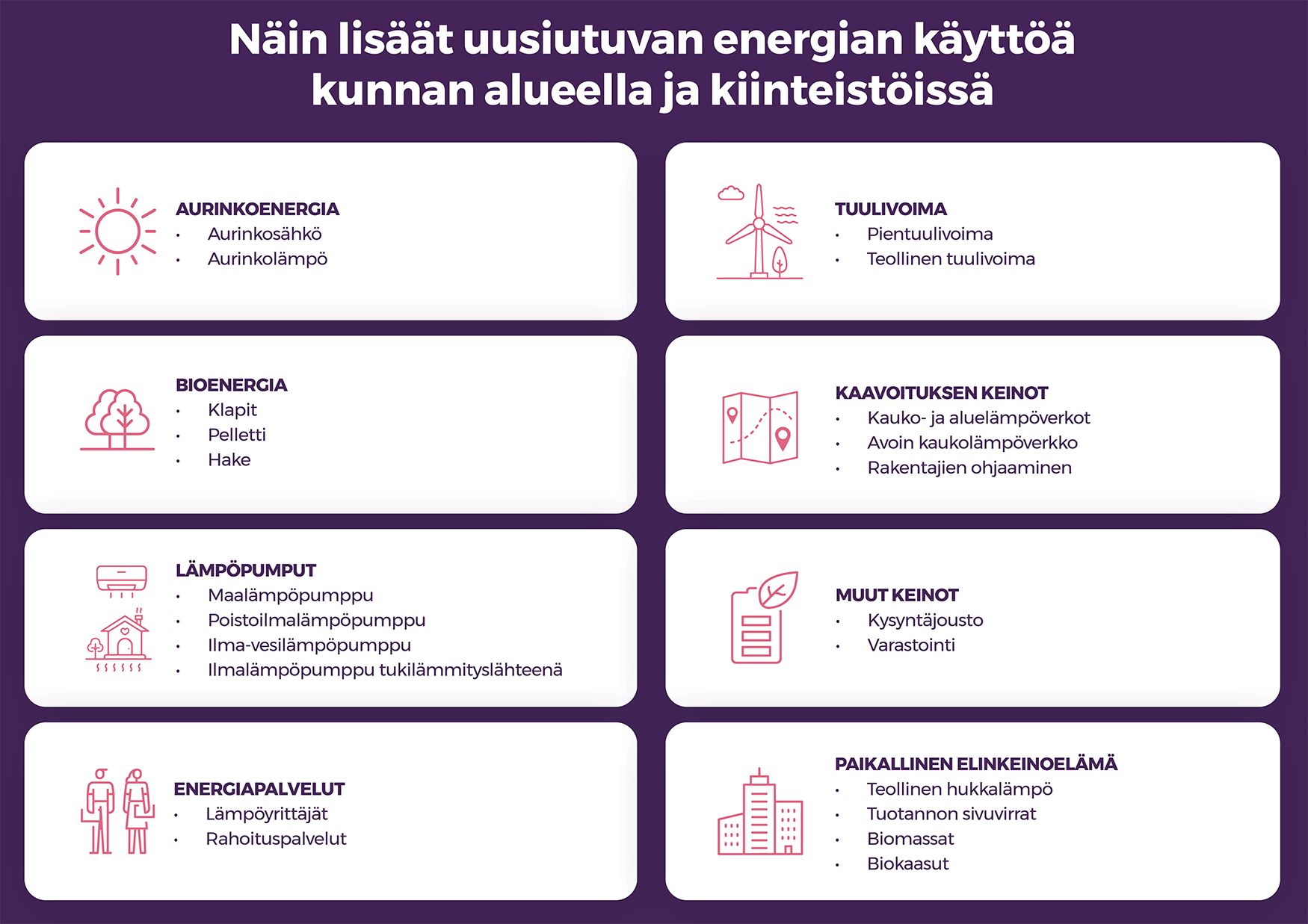 Kuva. Näin lisäät uusiutuvan energian käyttöä kunnan alueella ja kiinteistöissä. (Kuva aukeaa isommaksi hiirellä.)