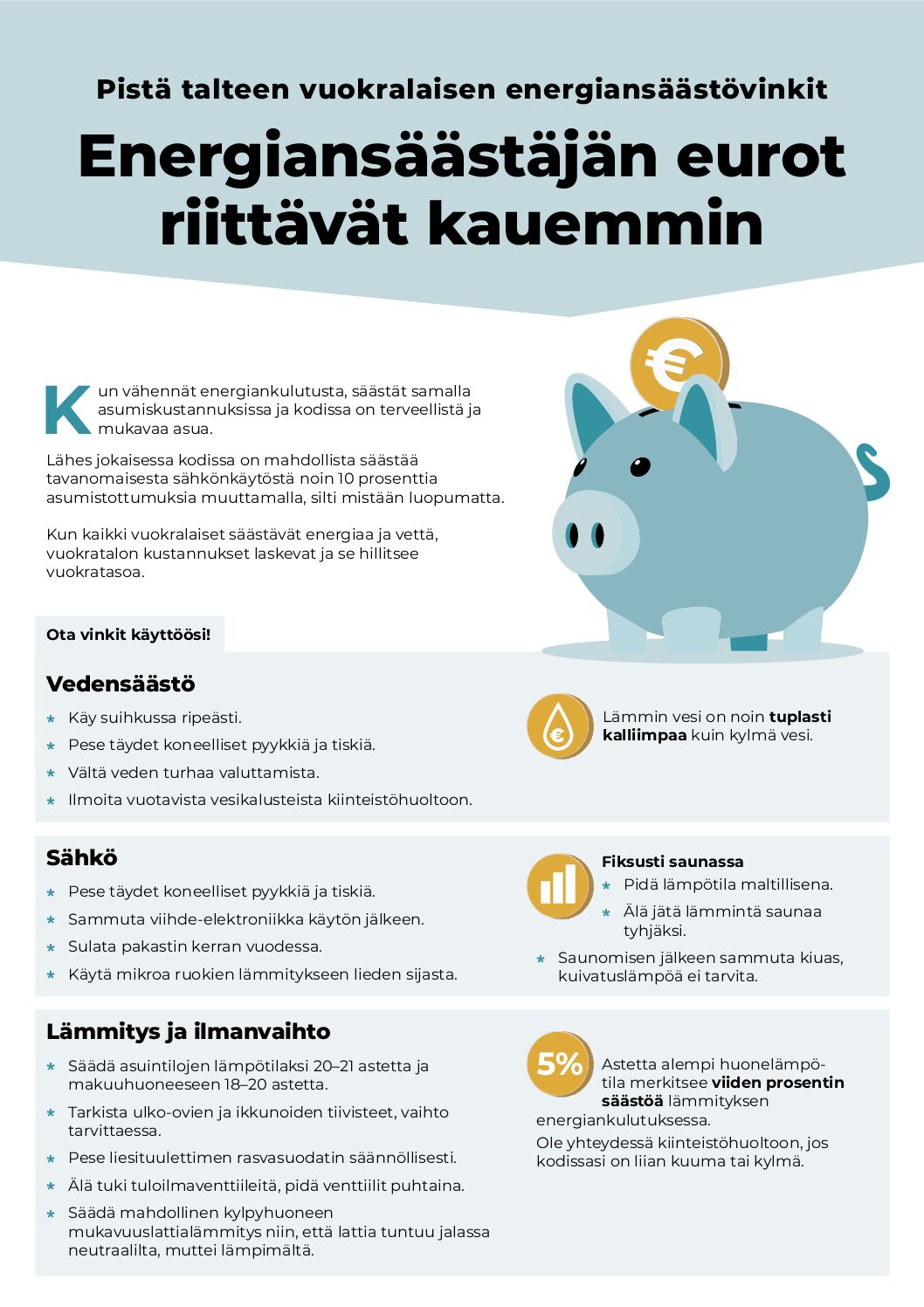 Energiansäästäjän eurot riittävät kauemmin ja energiansäästö auttaa pienentämään vuokratalon kustannuksia. Vinkkikirjeessä on tiiviit ohjeet asukkaan energiansäästöön veden, kotitaloussähkön sekä lämmityksen ja ilmanvaihdon osalta sekä ohjeita omaan tarpeeseen sopivan sähkösopimuksen valintaan. Vinkkikirjeen voi tulostaa ja jakaa vuokralaisille esimerkiksi postin mukana tai liittää vuokralaisen tietopakettiin.